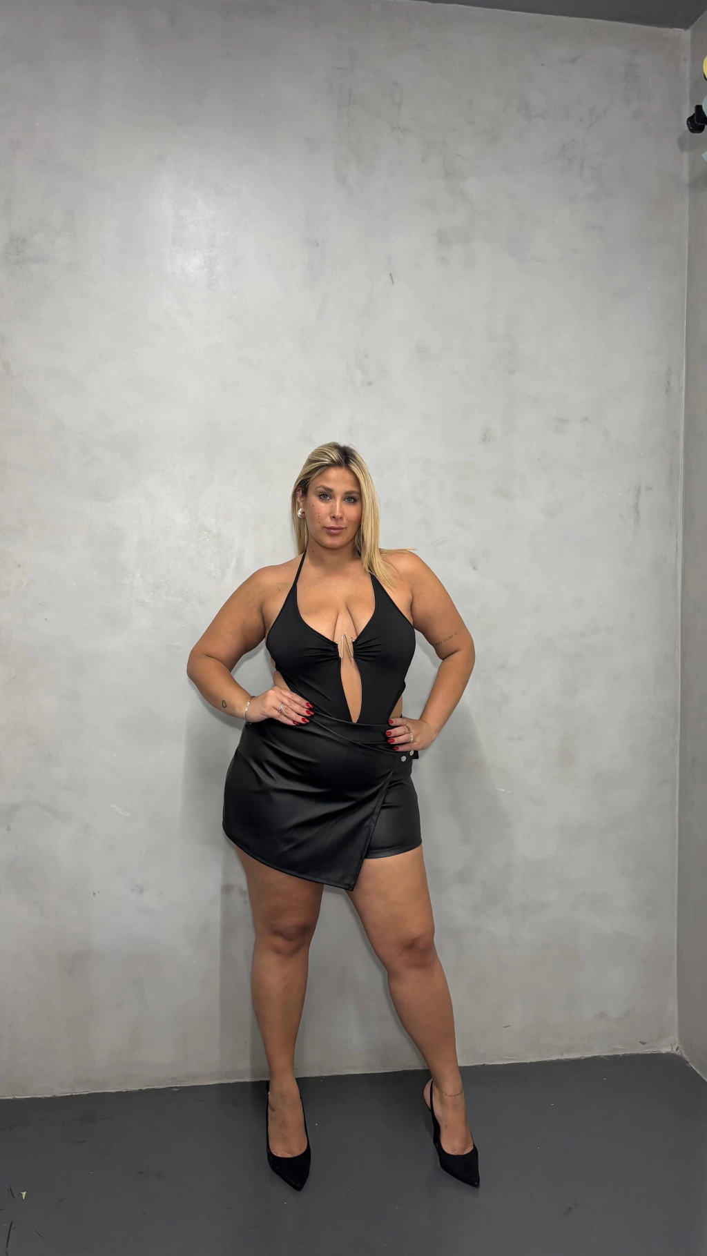 SHORT POLLERA DUBAI: elegante y versátil, confeccionada en cuerina negra. Destaca por su detalle de dos botones frontales que aportan un toque moderno y sofisticado.
